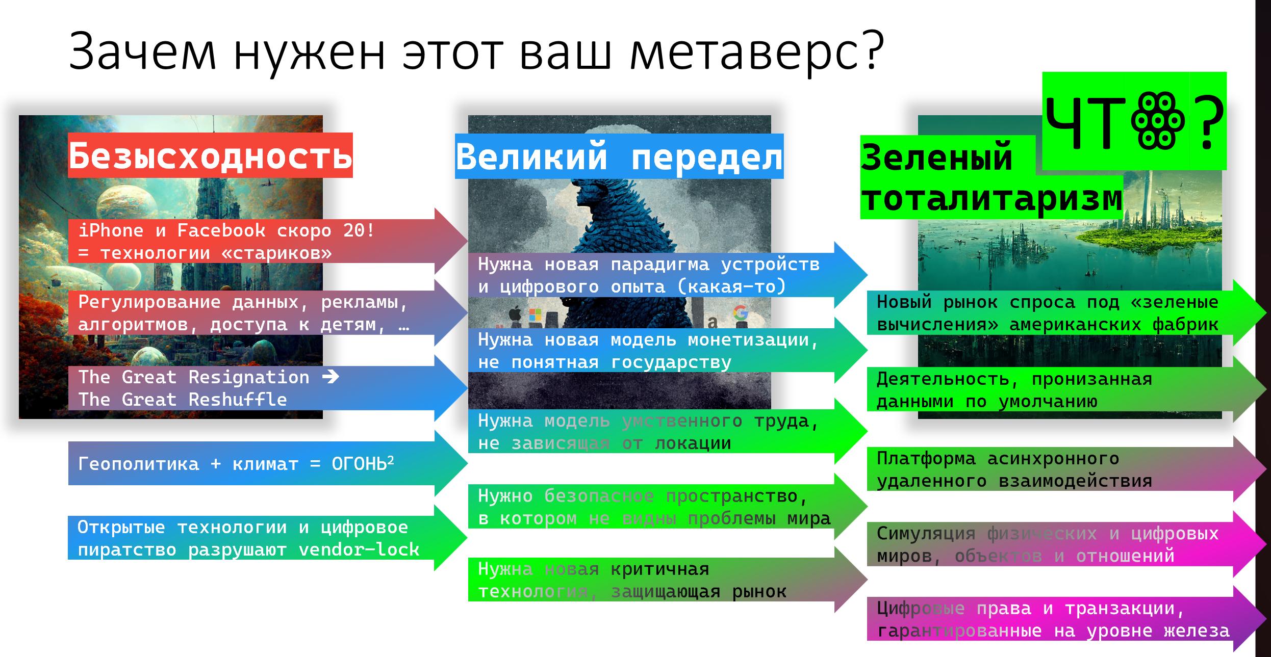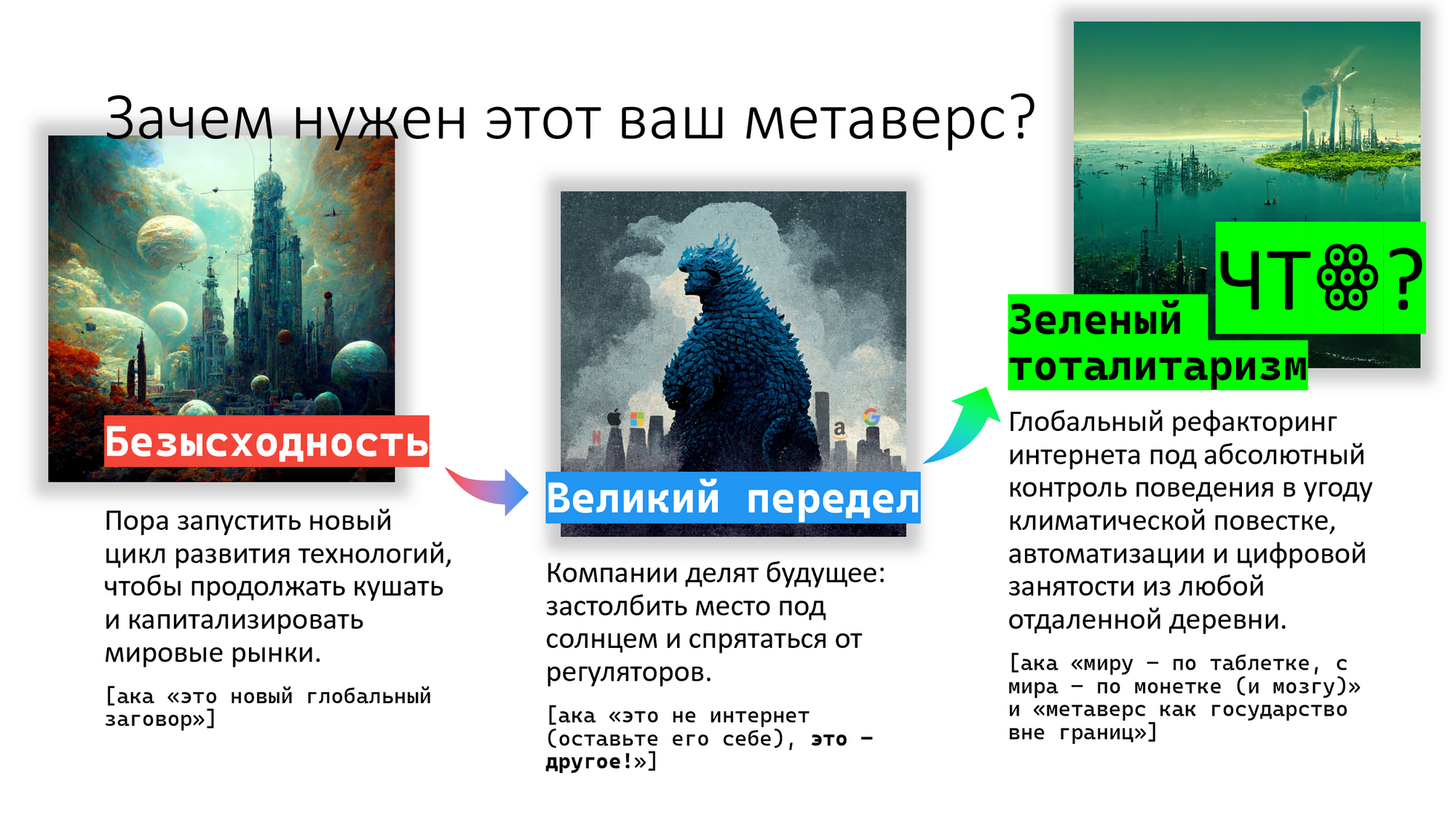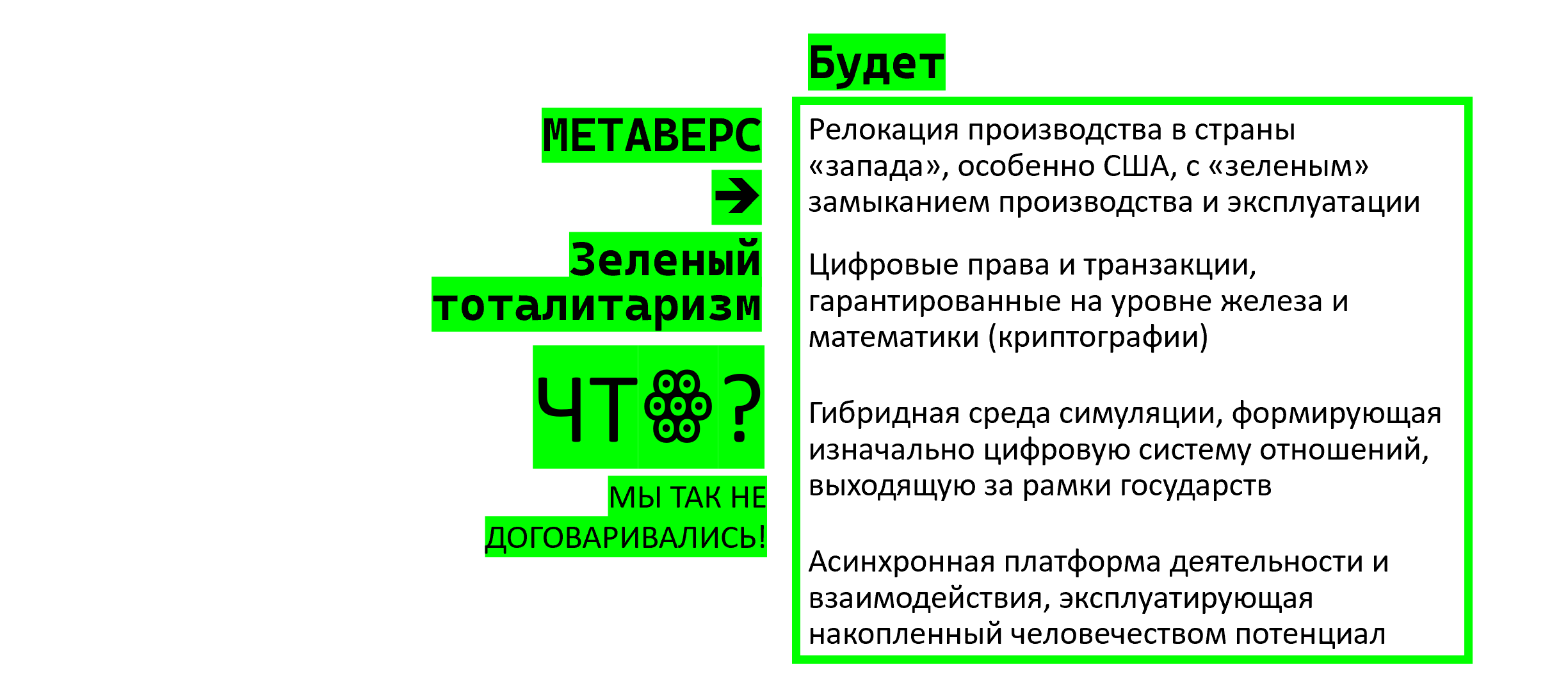 Вот такая у нас картина получается. И если вы внимательно посмотрите на список справа на картинке выше, то заменив “зеленый тоталитаризм” на “метаверс”, вы не увидите большой разницы.