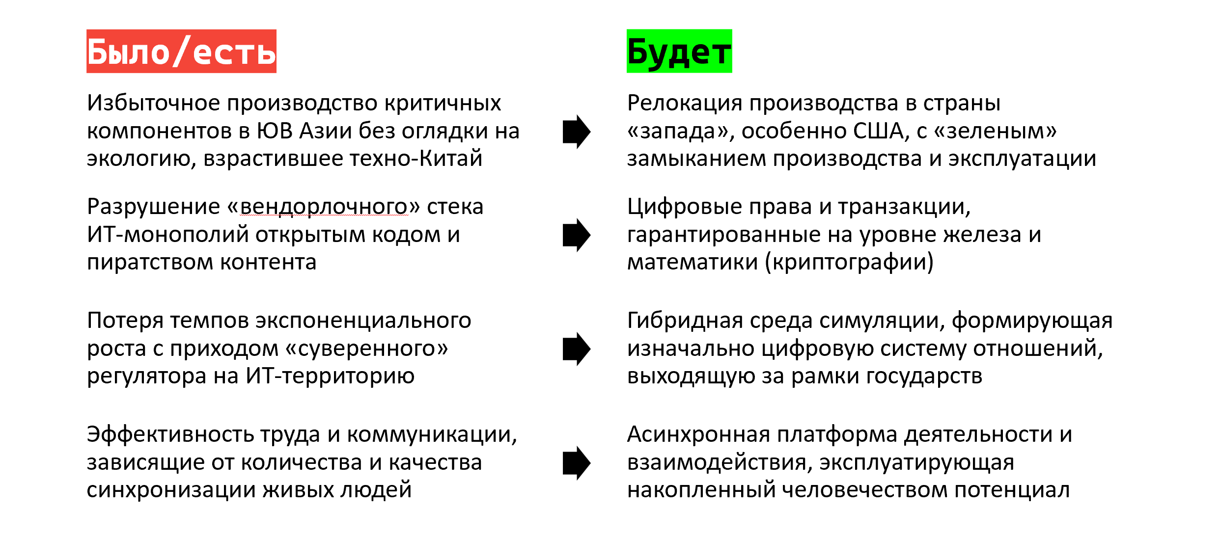 Для держателей технологической политики в [западных] государствах и корпорациях это ознает, что нужно запустить новый цикл развития технологий, в который будет вшита новая модель монетизации, распределения прибыли, удержания контроля и ускорения развития связанных отраслей.